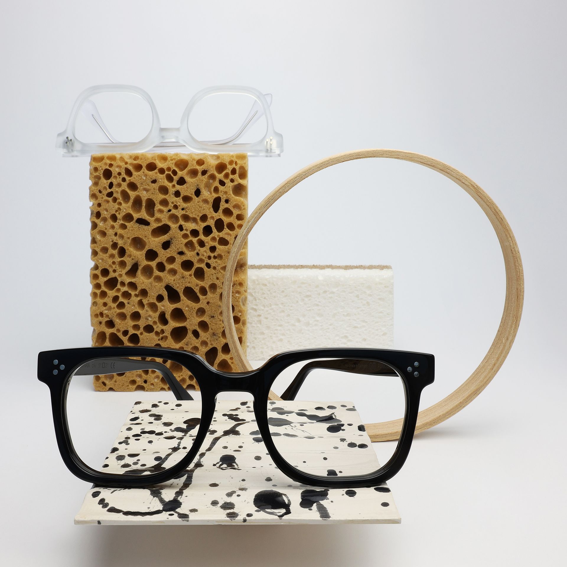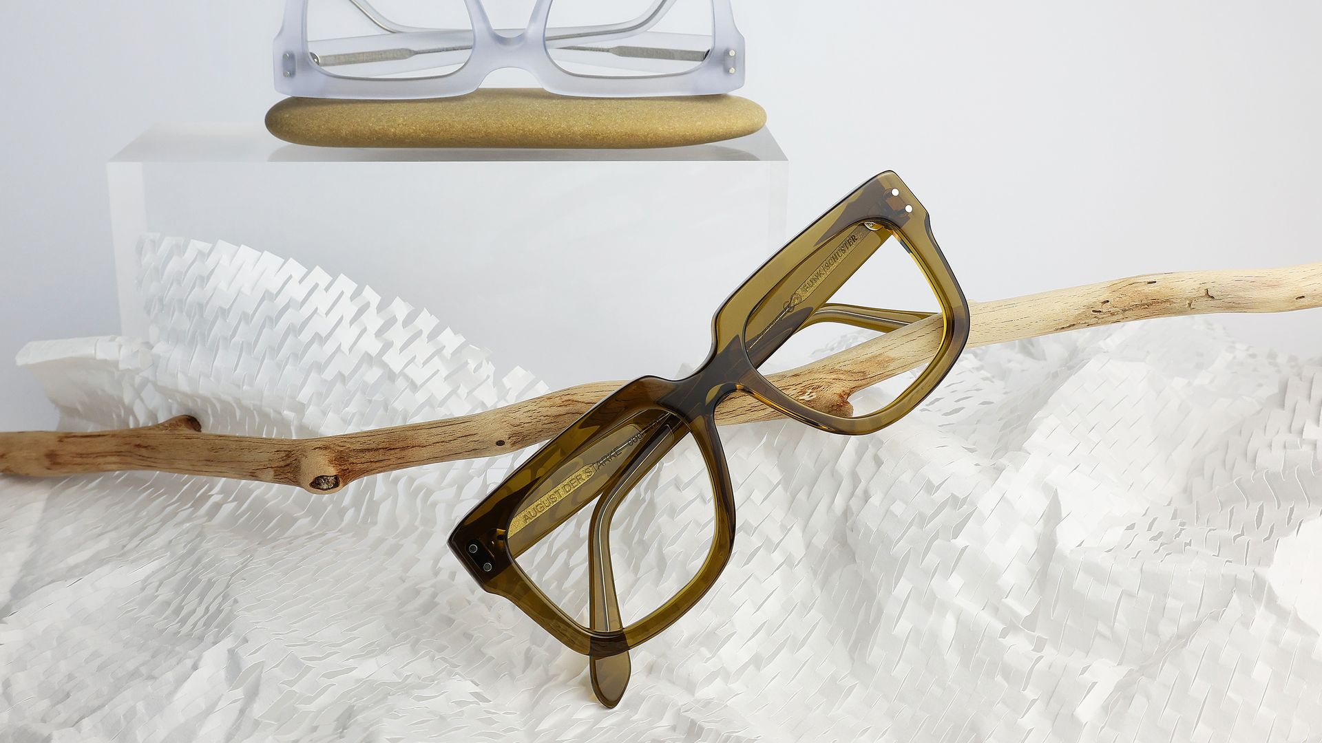 Für die Foto-Reihe kamen überwiegend Acetat-Platten und Naturmaterialien zum Einsatz. Die klare und ausdrucksstarke Formensprache der Fassungen wird dabei von unterschiedlicher Haptik und Struktur kontrastiert.
